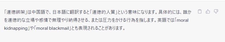わからないことがわかったので、「道德綁架」の日本語訳を調べることにしました。